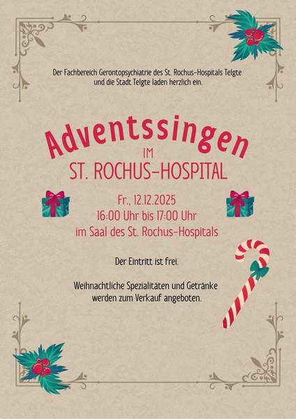 Der Fachbereich Gerontopsychiatrie des St. Rochus-Hospitals und die Stadt Telgte laden die Bürgerinnen und Bürger der Region herzlich zum Adventssingen in das St. Rochus-Hospital ein. Die Veranstaltung findet am Freitag, den 12. Dezember 2025, von 16:00 bis circa 17:00 Uhr im festlich geschmückten Saal des Hospitals statt.